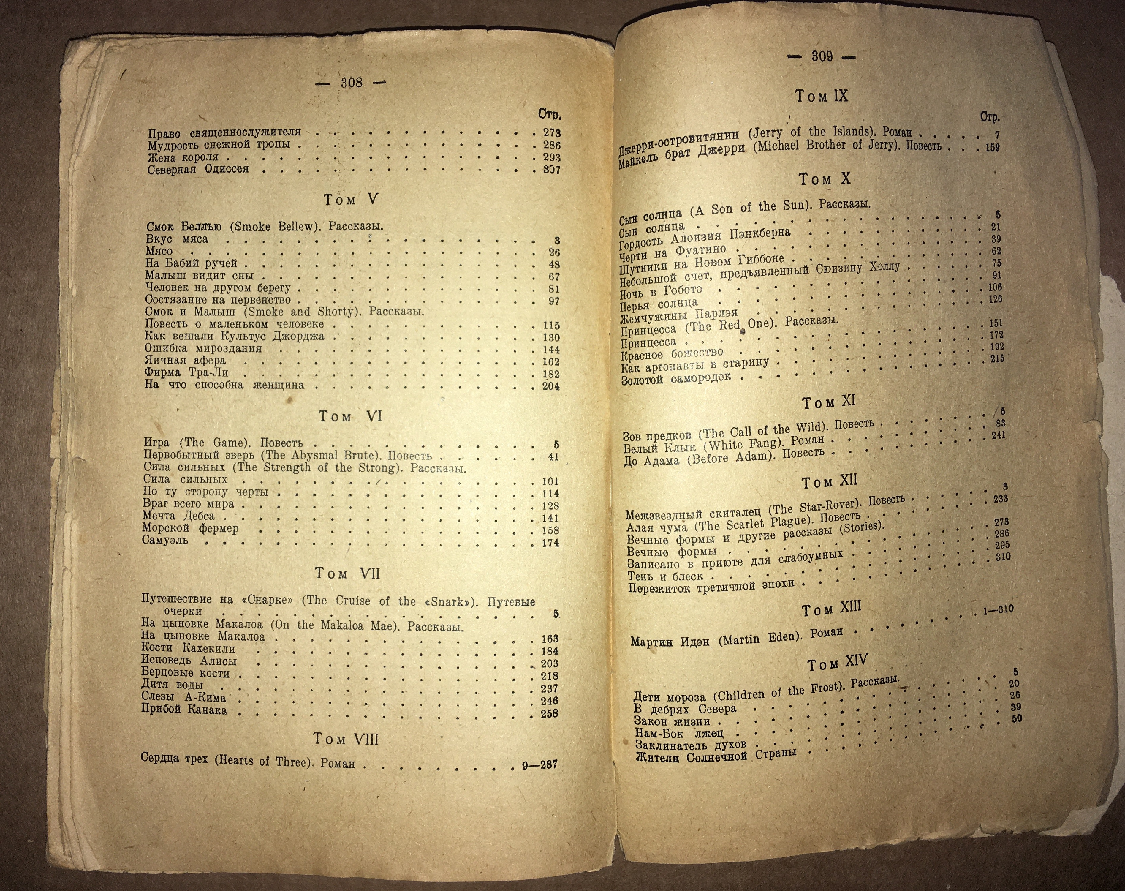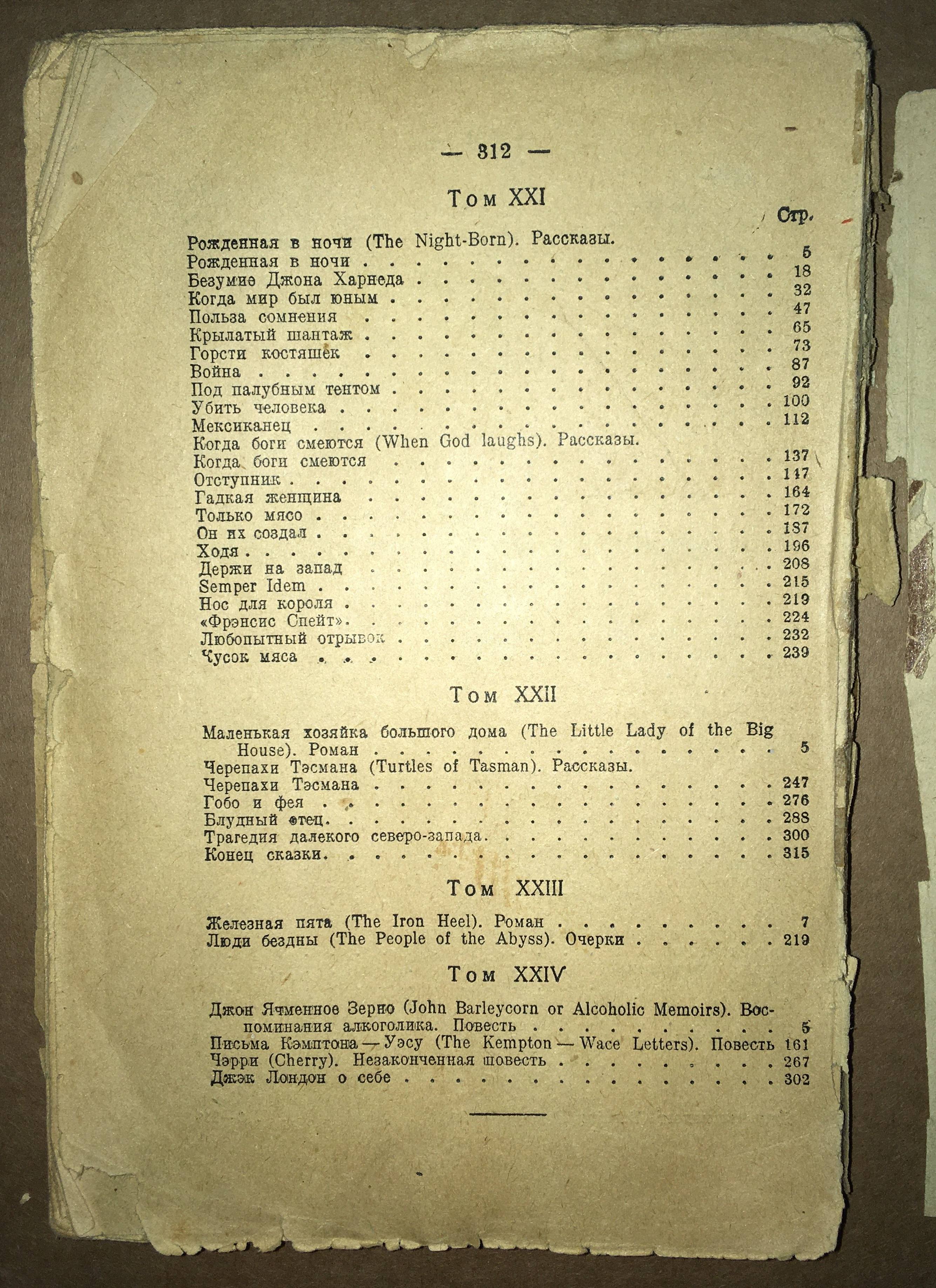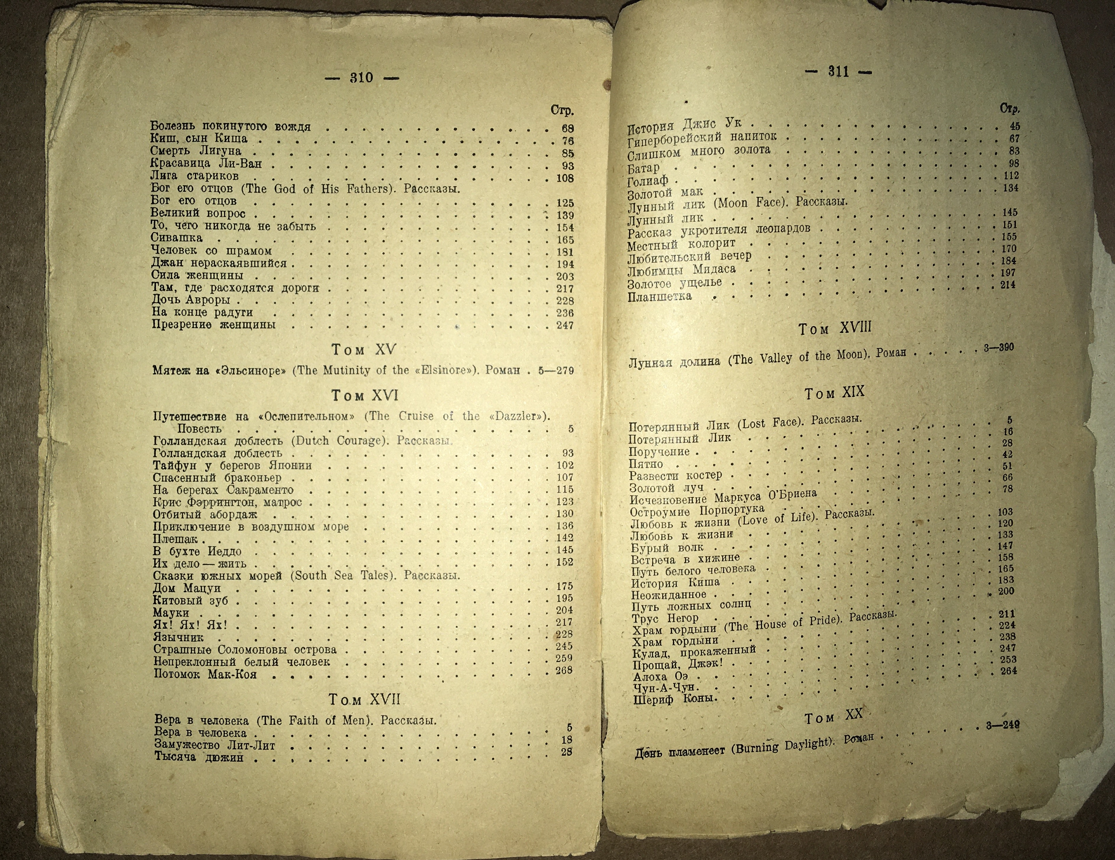 Рассказы в сборниках: «Храм гордыни», «Кулау-прокаженный», «Прощай Джек», «Алоха Оэ», «Шериф Коны», «Чун А-чун»,«Принцесса», «Красное Божество», «Как аргонавты в старину», «Золотой самородок», «Вечные Формы», «Записано в приюте для слабоумных», «Тень и блеск», «Пережиток третичной эпохи».