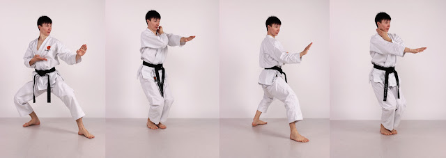 | Шуто-уке в стойке кокуцу-дачи; Промежуточное положение при шаге в стойке кокуцу-дачи и замах для шуто-уке |