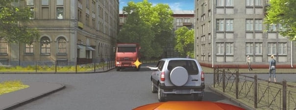 - 2. Имеет преимущественное право на движение, так как находится справа от грузового автомобиля.
