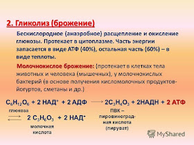 С6Н12О6 + 2АДФ + 2Н3РО4 + 2НАД+ ® 2С3Н4О3 + 2АТФ + 2НАД-Н2+ + 2Н2О.