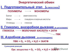 | Катаболизм (энергетический обмен, диссимиляция) | Совокупность химических реакций, приводящих к образованию простых веществ из более сложных | Гидролиз полимеров до мономеров и расщепление последних до низкомолекулярных соединений углекислого газа, воды, аммиака и других веществ | Энергия выделяется |