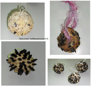В ходе изучения темы «зимующие птицы» ребята вместе с родителями изготовили для птиц самые разнообразные угощения. Каждый проявил фантазию. Получились и «печенья», и пирожные на ниточке.