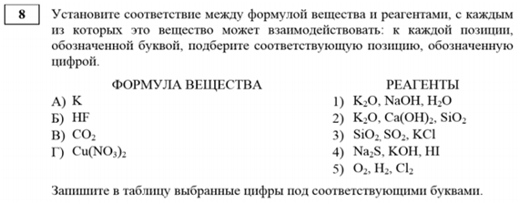 В данном номере от учеников требуется соотнести формулы вещества и реагенты. Ошибаются ученики из-за неумения характеризовать общие химические свойства основных классов неорганических и органических соединений.